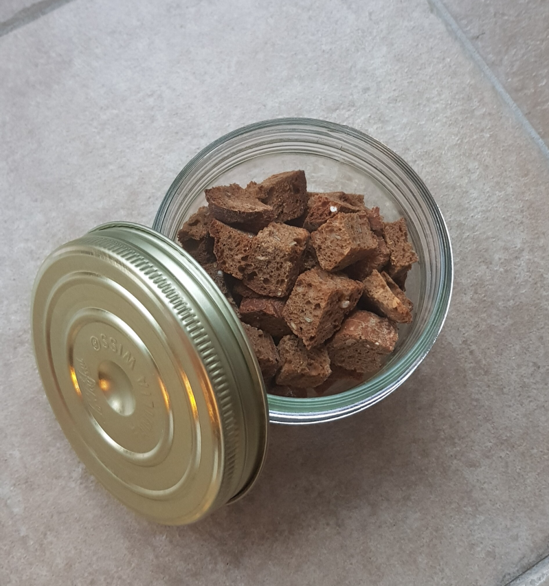 In een afgesloten glazen potje kun je de croutons makkelijk enkele weken bewaren.