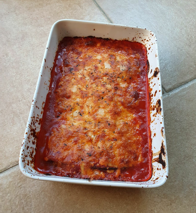 neem een ovenschaal en leg onderaan een laagje saus, dan een aubergineplakje, terug saus enzovoort