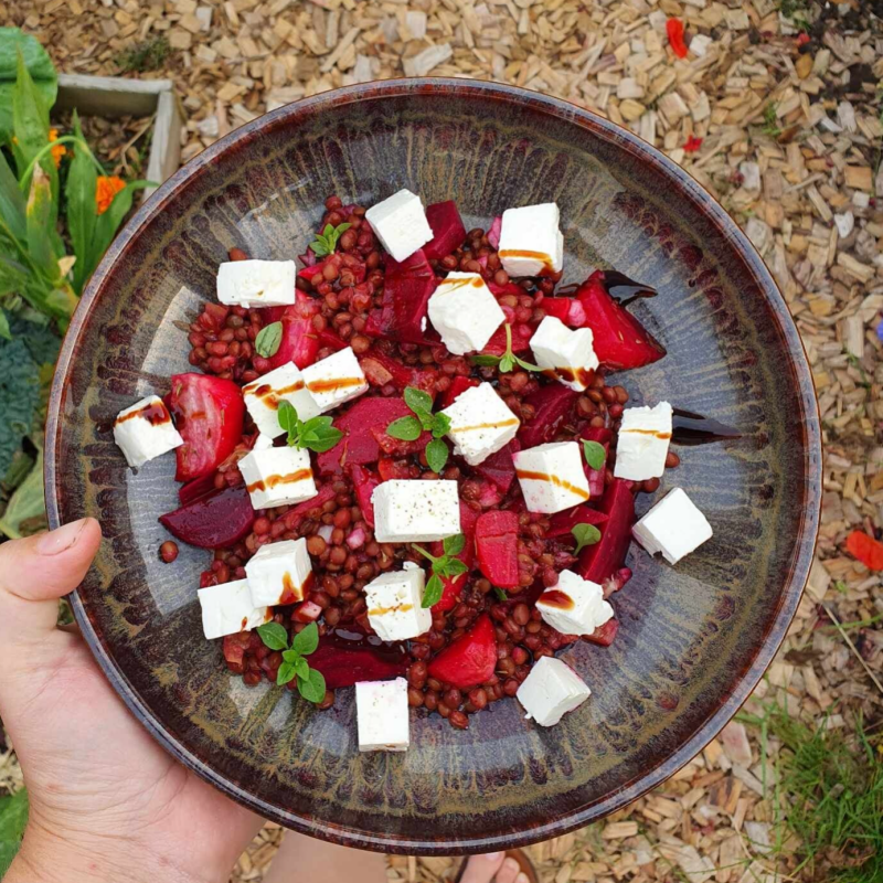 Dresseer de linzen en lauwe bietjes in een bord. Giet er wat van de 'braadjus' over.